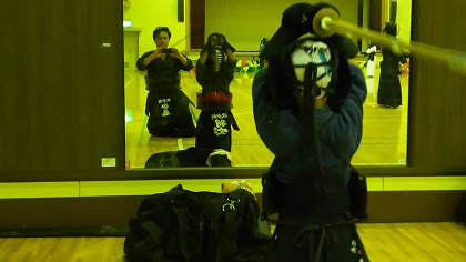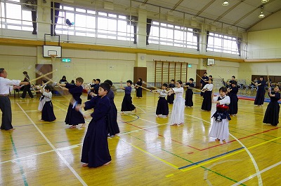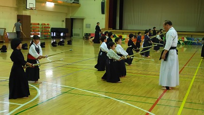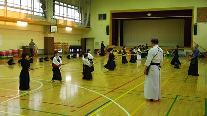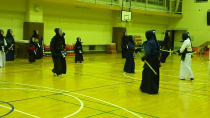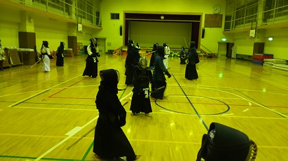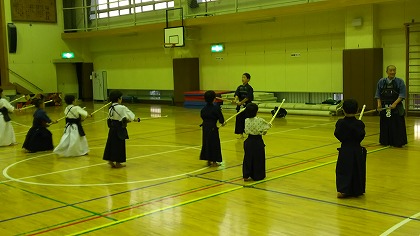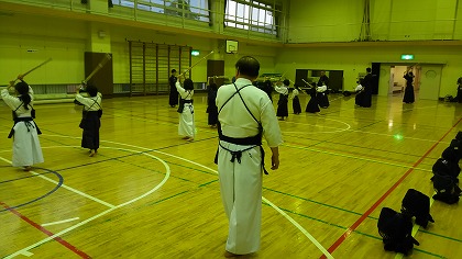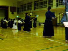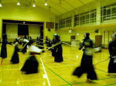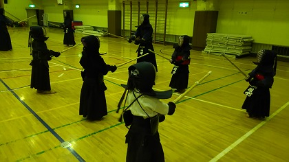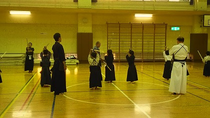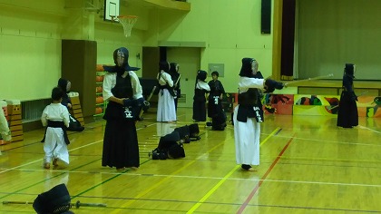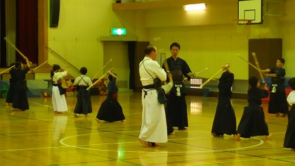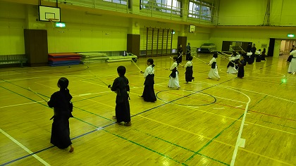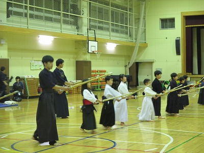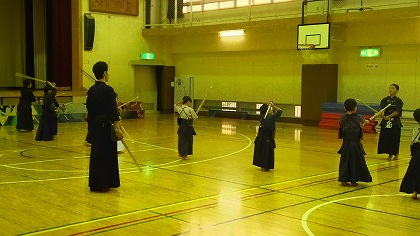 | 準備運動の後、防具を着けずに基本の稽古が始まります。 ここで剣道の基本の足さばき、素振りをみっちりやります。 |