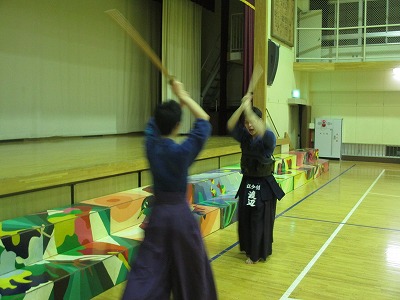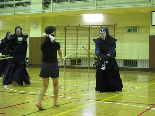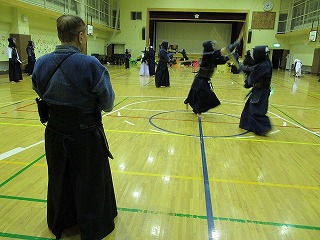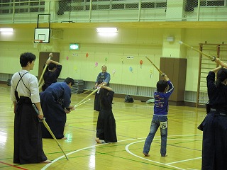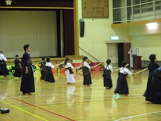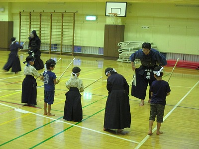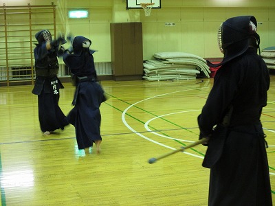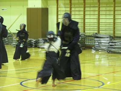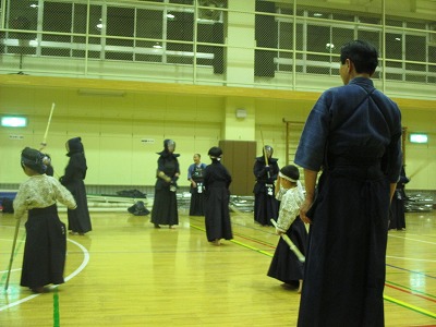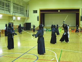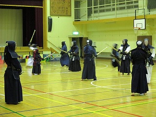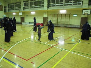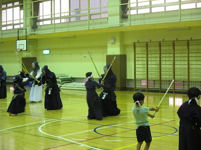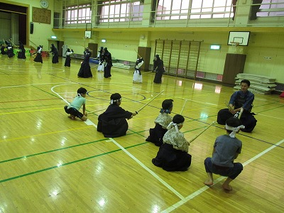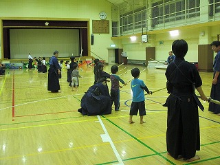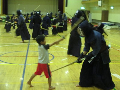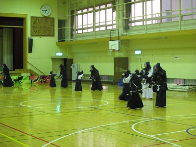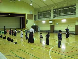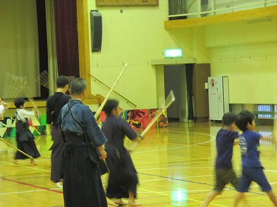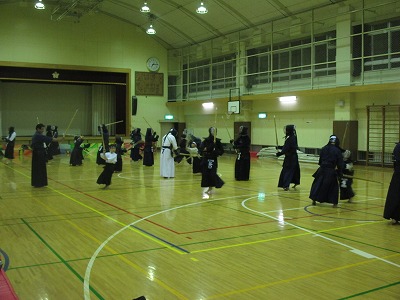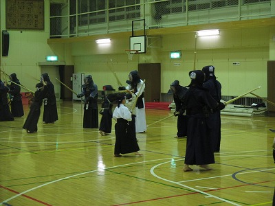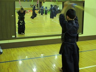 | 準備運動の後、防具を着けずに基本の稽古が始まります。 ここで剣道の基本の足さばき、素振りをみっちりやります。 |